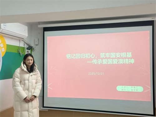 为深化青年学生对澳门回归历史与“一国两制”实践的认知,强化国家安全意识,传承弘扬爱国爱澳精神,12月23日晚,湖北职业技术学院财经与旅游学院于“仁心仁术”一站式学生社区开展“铭记回归初心,筑牢国安根基——传承爱国爱澳精神”主题活动,引导学生筑牢国家安全观念,厚植家国情怀。