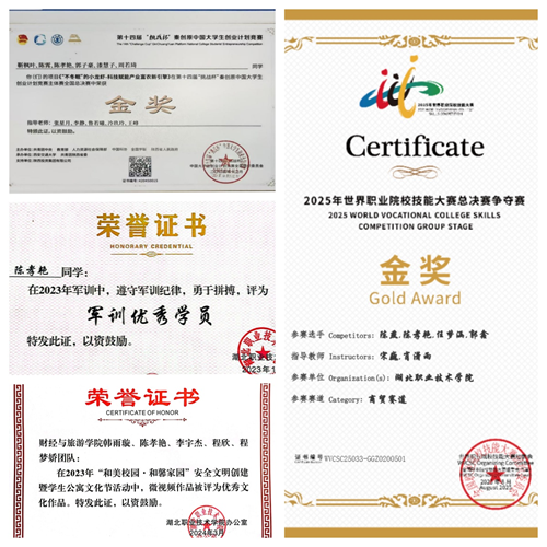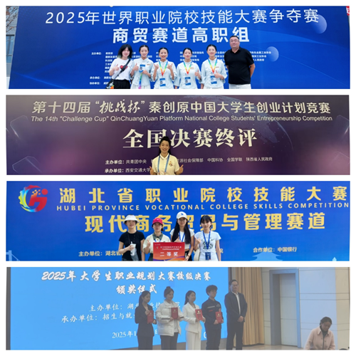 2024年11月,作为《“不冬眠”的小龙虾-科技赋能产业富农新引擎》项目的核心成员,在原定主讲人临近国赛突发高烧的情况下,主动接过主讲重任。她连续三天熬夜修改路演脚本,对着镜子反复练习肢体语言和情绪表达,最终在第十四届“挑战杯”中国大学生创业计划竞赛全国总决赛上,凭借清晰的逻辑和自信的表达打动评委,助力团队成功摘得全国金奖,成为项目夺冠的关键一环。2025年7月,她再次出战湖北省职业院校技能大赛现代商务与管理赛道,带领团队从全省百余支队伍中突围,拿下二等奖。仅仅一个月后,她站上2025年世界职业院校技能大赛商贸赛道的国家级赛场,凭借扎实的商务谈判技巧和数据分析能力,助力团队斩获国赛金奖,在国家级舞台上展现职教学生的专业实力。这一系列沉甸甸的奖项,不仅是对她过硬专业技能和创新思维的最佳印证,更是她勇于挑战、团结协作、永不言弃的拼搏精神的生动写照。