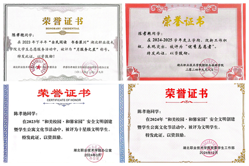她活跃在校内外多个志愿服务场景:在2023年“全民阅读书香澴川”志愿服务活动中,她热情周到,被评为 “月服务之星” ;在2024年秋季迎新工作中,她主动担当、耐心引导,荣获 “优秀志愿者”称号;在校园文明创建、社区公益服务等活动中,也总能看到她忙碌而坚定的身影。截至目前,她累计参与志愿服务活动50余次,志愿时长近200小时。从受助到助人,她用实际行动将温暖传递,将“奉献、友爱、互助、进步”的志愿精神内化于心、外化于行,也荣获了“文明学生”的称号。