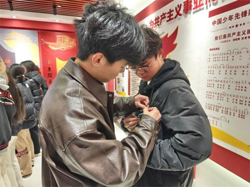 仪式在庄严的团歌声中拉开序幕。现场通过讲解团旗、团徽、团歌的历史内涵与象征意义,加深新团员对团组织文化的理解,强化其身份认同感和使命感。随后,新团员们列队走上台,佩戴上闪耀的团徽,一枚枚团徽不仅是共青团员的身份象征,更寄托着为青春使命不懈奋斗的郑重承诺。在主持人的带领下,全体新团员面向团旗庄严宣誓,铿锵有力的誓言回荡在现场,彰显着他们“听党话、跟党走”的坚定决心,以及为共产主义事业贡献青春力量的赤诚初心。